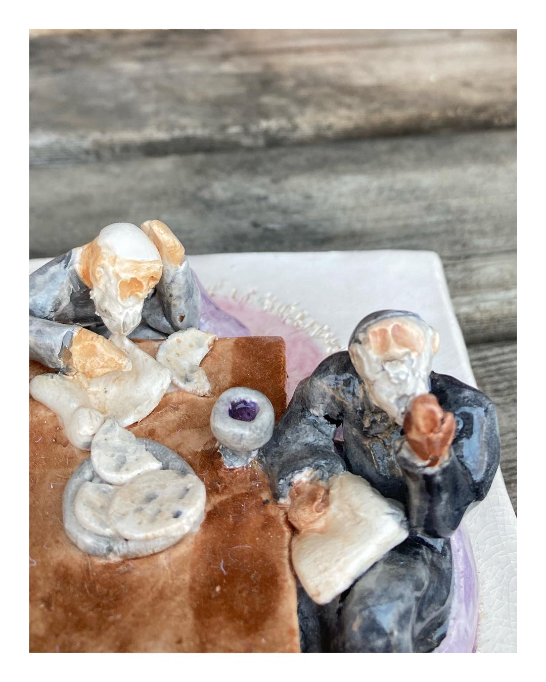 Built into the plate’s structure are six recessed spaces for the traditional seder items, surrounding the central tableau like a theatrical stage. The matzah, wine, haggadah scrolls, and saltwater bowls are all rendered in clay, creating a timeless celebration of storytelling, memory, and Jewish resilience.